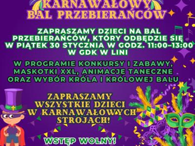 26.01.2026 Aktualności Bal przebierańców! Zapraszamy dzieci na bal przebierańców, który odbędzie się 🗓️ w piątek, 30 stycznia ⏰ w godz. 11:00–13:00 📌 w GDK w Lini W programie: - konkursy i zabawy - maskotki...
